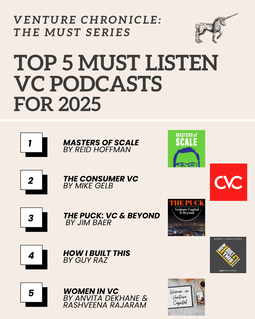 5. Closing out the top 5 is Women in Venture Capital Podcast, run by Harvard Business School students, Anvita Dekhane & Rashveena Rajaram, when they're not at UiPath & General Catalyst changing the world, they host this fantastic podcast, shedding light on women breaking into the historically male-dominated industry from various facets of Venture Capital, from analysts to MDs, this is one of our favorites. Spotify Link