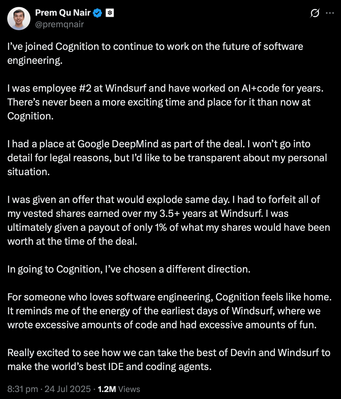 He goes from building Windsurf as one of the earliest engineers, his equity worth $24M, a whirlwind of a 72 hours sponsored by Google erases everything, his shares? worth only $240K or 1% of what he was owed.
